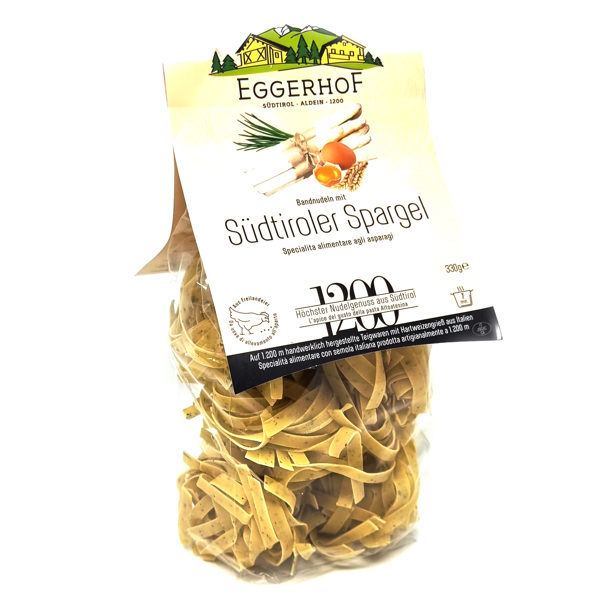 Die Bandnudeln mit Spargeln vom Eggerhof in Aldein bringen das feine Aroma des edlen Frühlingsspross in einer kreativen Interpretation auf den Teller. Für die auf 1.200 m ü. M. handgearbeiteten Nudeln werden nur bester Hartweizengries, hofeigene Eier und edler Südtiroler Spargel verwendet.