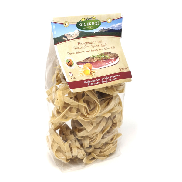 Zutaten: Hartweizengriess, frische Freilandeier 20%, Wasser, Südtiroler Speck 7%,(Schweinefleisch, Salz, Dextrose,Gewürze, Konservierungsstoffe:E252), Weichweizenmehl Typ 0 1,4%, Petersilie, Gewürze