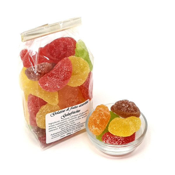 Le gelatine di frutta sono dolciumi semimorbidi a base di amido gelatinizzato, disponibili sotto forma di frutta come lamponi, more, fettine d'arancia o spicchi di limone.