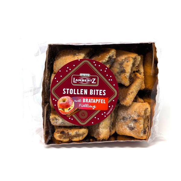 🎄 I piccoli Bites della marca Lambertz uniscono un impasto di stollen cotto con una farcitura fruttata al “Bratapfel” – arricchita con purea di mela, uvetta e cannella, e avvolta in un sottile strato di zucchero. Prodotto in Germania secondo tradizione natalizia, perfetti come dolce snack da accompagnare con caffè o tè.