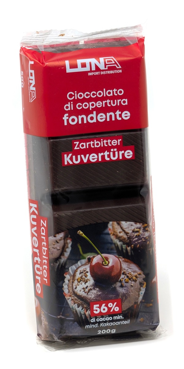 Ingredienti: pasta di cacao, zucchero, burro di cacao, emulsionante: lecitina di soia. Il prodotto può contenere tracce di glutine, latte, frutta a guscio e arachidi.