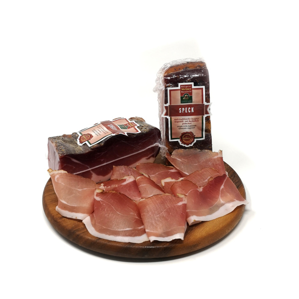 „Südtiroler Speck g.g.A." può essere denominato soltanto lo speck che è prodotto secondo i nostri criteri qualitativi e ne porta dunque il tipico marchio. Questo tipo di speck deve la sua unicità al principio “poco sale, poco fumo e tanta aria”. In media viene affumicato ..e maturato all’aria pura per 22 settimane. Non vengono aggiunti coloranti o aromatizzanti artificiali