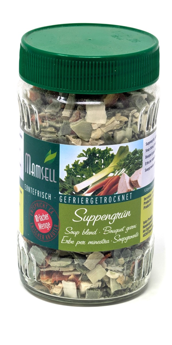 Mamsell Verdure per Minestra Miscela equilibrata di verdure classiche per brodo, liofilizzate con cura per preservare al meglio aroma e colore. Perfette per zuppe, salse o piatti salati – pratiche e dal gusto intenso. 121,43 €/kg Dimensione: 35 g Prezzo: 4,25 € Aggiungi al carrello continua lo shopping condividi su: