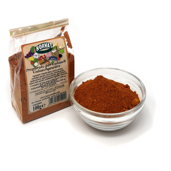 Spezie per gulasch-Horvat(senza sale) Ingredienti: Paprika dolce, cipolla, carvi, pomodoro, pimento, carota, peperoncini, prezzemolo, aglio, rosmarino, sedano, semi 36,50 €/kg Dimensione: 100 g Prezzo: 3,65 € Aggiungi al carrello continua lo shopping condividi su: